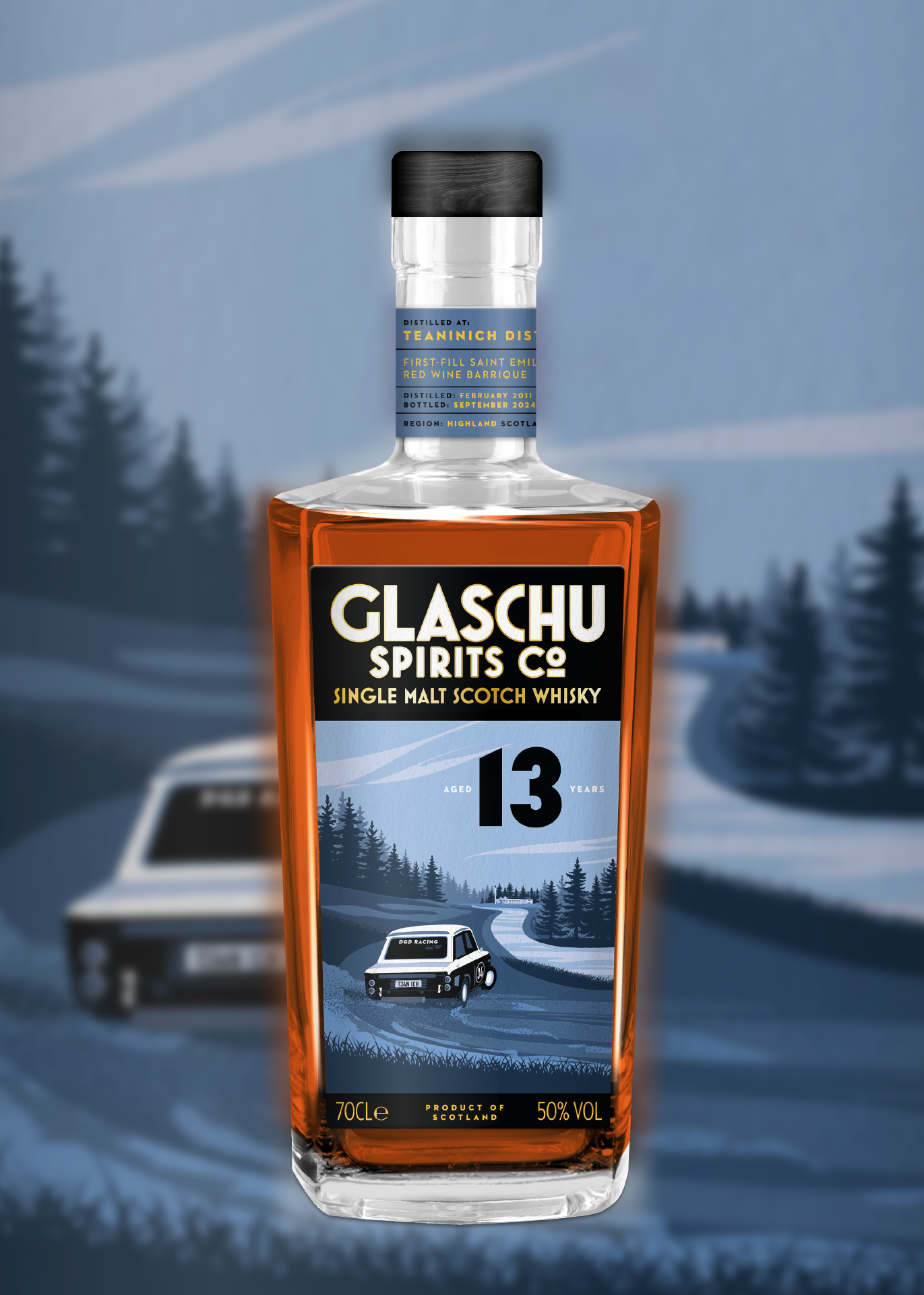 The label artwork features the iconic Hillman Imp. A rally-spec'd, Scottish-built car from the 1960's, seen drifting round a dirt track adjacent to the river Alness, at Teaninich Distillery.